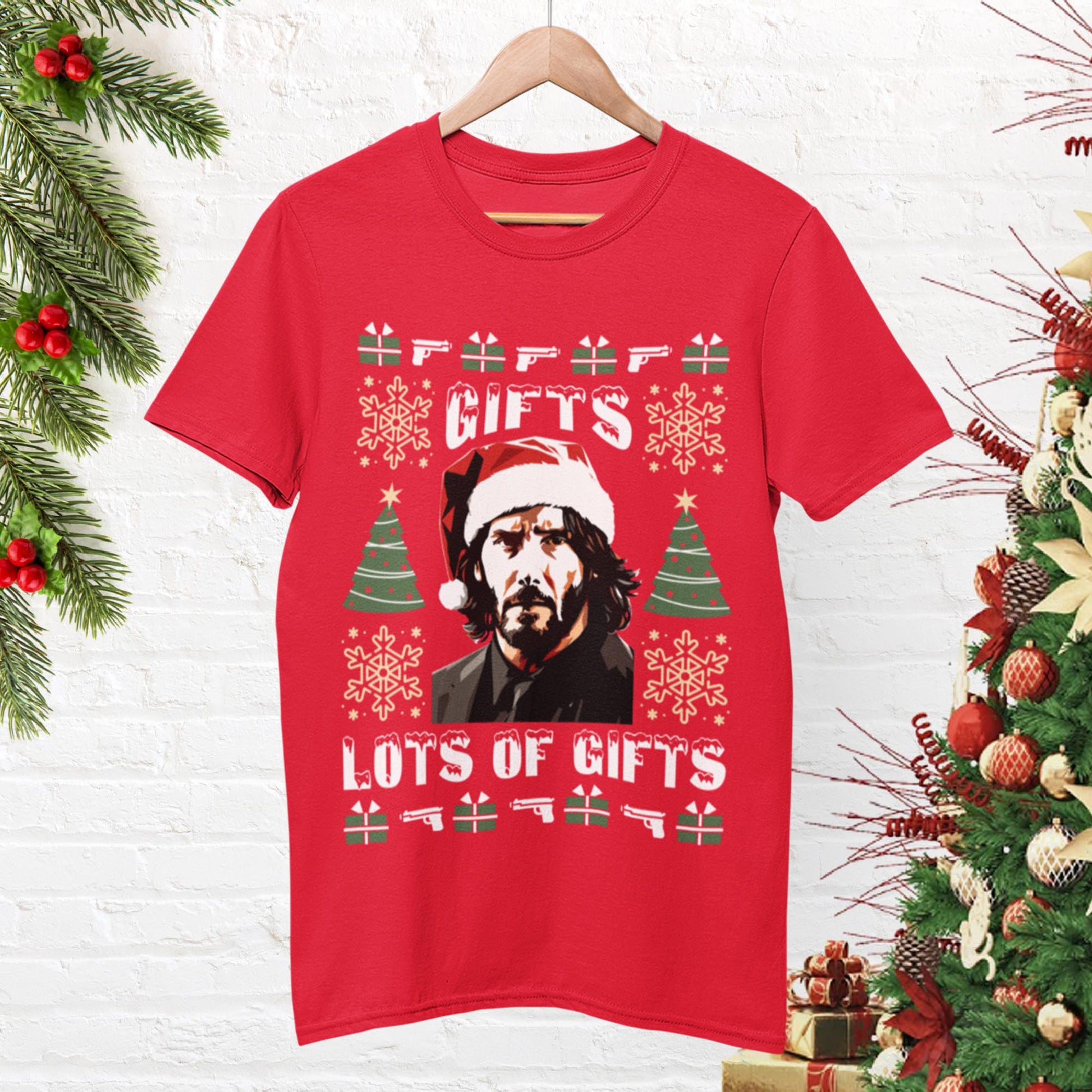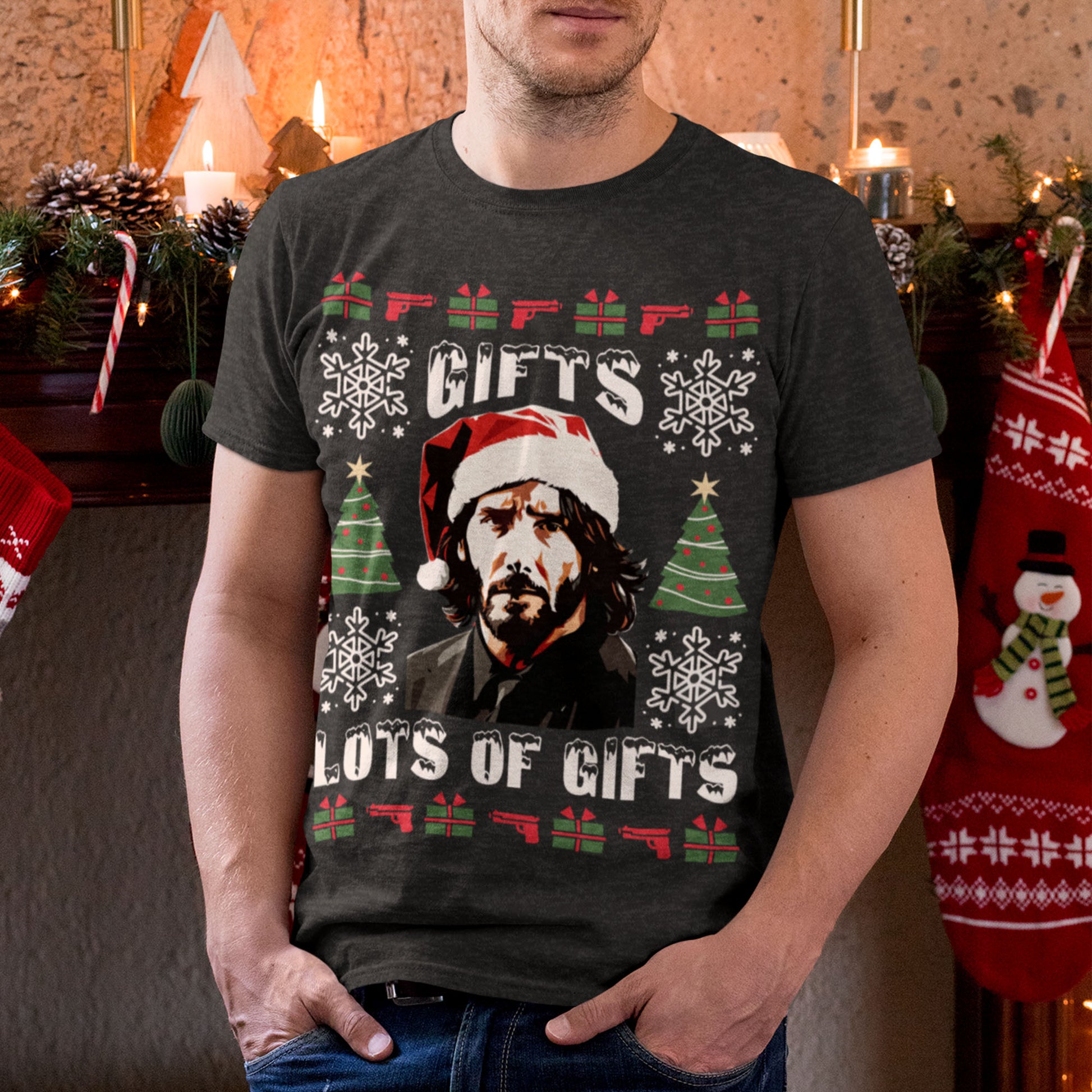 Get ready to celebrate the holidays in true John Wick style with our 'Gifts. Lots of gifts.' Christmas t-shirt. Whether you're a fan of Keanu Reeves or just love a good punchline, this t-shirt captures the essence of giving and receiving with a twist of cinematic cool. Unleash your inner 'Baba Yaga' and make a statement at every holiday gathering. It's the season of giving, after all!